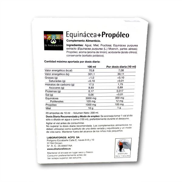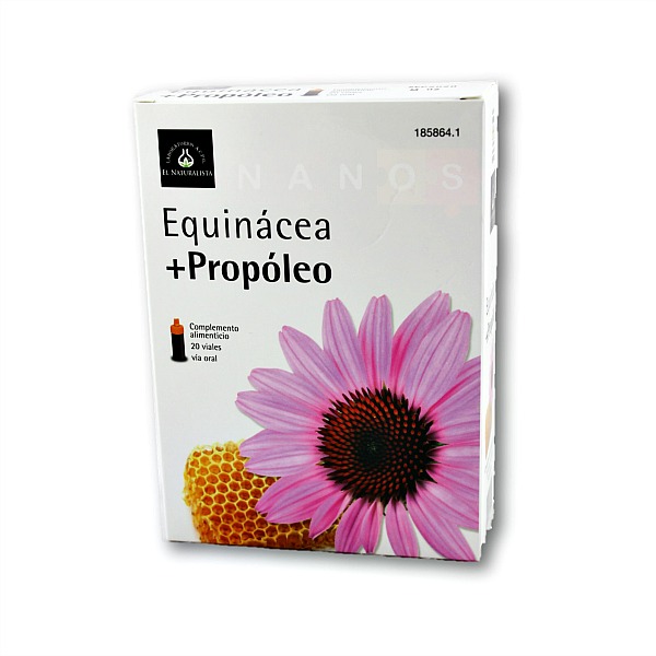 Equinácea + Propóleo El Naturalista es un Complemento Alimenticio en viales que combina las propiedades de la Equinácea con acción inmunológica, con los beneficios del Propóleo para conseguir una ayuda eficaz en la prevención y el tratamiento de catarros y otros procesos del aparato respiratorio.